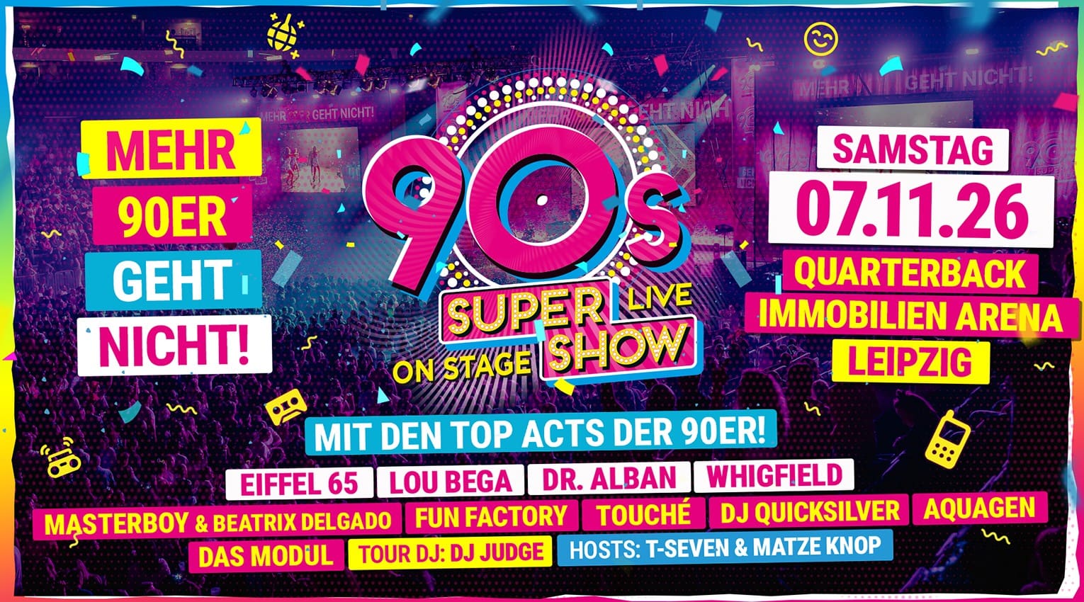 Die große 90er Party in Leipzig! 2026 ist es wieder soweit: Die 90s Super Show kommt zurück nach Sachsen. Wir feiern die größte 90er Party Sachsens in der Quarterback Immobilien Arena Leipzig. Sichert euch gleich euer Ticket für die Zeitreise in die Neunziger in Leipzig!