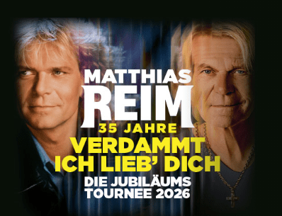 Sein erstes Album – seine größten Hits – und noch viel mehr! Als Hommage an den Song, der vor über drei Jahrzehnten alles ins Rollen brachte, geht Matthias Reim 2026 auf große Jubiläumstournee: „MATTHIAS REIM – 35 JAHRE ‚VERDAMMT, ICH LIEB’ DICH‘ – DIE Jubiläumstournee 2026“ feiert das Debüt-Album eines Ausnahmekünstlers, der auch heute noch zu den wichtigsten und populärsten Größen des Showbiz gehört.